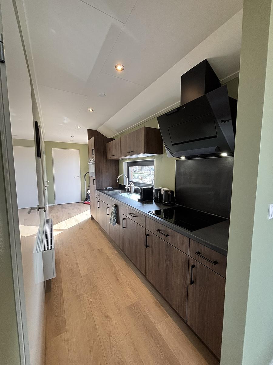 De lodge beschikt over een ruime woonkamer met een open keuken waar je samen kunt koken en genieten. De keuken is volledig ingericht en voorzien van een koelkast met vriesvak, vaatwasser, inductiekookplaat, oven/magnetron en een Nespresso koffiezetapparaat.